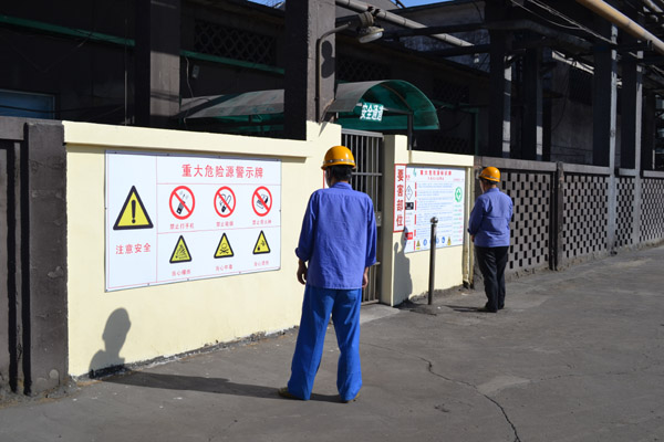 圖為該車間員工在辨識重大危險源告知牌。