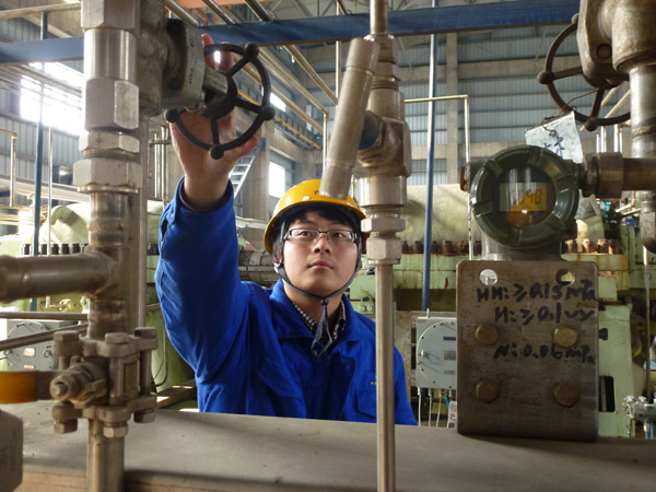 圖為合成工段操作人員正按工藝要求調節(jié)閥門。