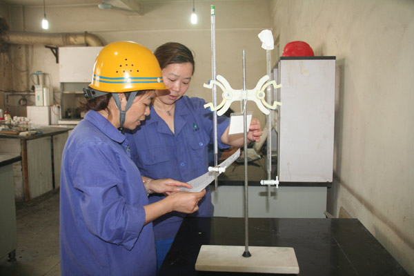 圖為該公司檢驗中心員工將經過銅陵市計量測試研究所檢定的酸式滴定管送到磷酸車間化驗分析班,并了解該化驗分析室實驗條件和需求。(陳沐)