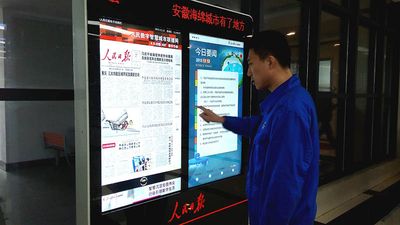 日前,一臺《人民日報》電子閱報欄落地z6mg人生就是博化工公司弘毅樓食堂內,吸引該公司員工們點擊閱讀。