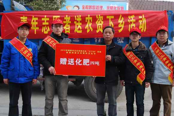 1月10日,z6mg人生就是博化工團委和銅官山化工團委組織青年志愿者,赴銅陵市郊區五洲村開展“送化肥下鄉”活動,給當地村民送去4噸化肥和幾十本化肥使用手冊,受到了當地農民群眾的感謝和好評。圖為銅化青年志愿者向五洲村村民贈送化肥。